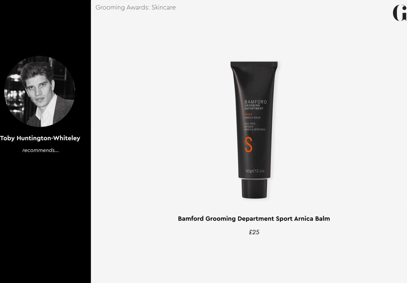 Model and personal trainer Toby Huntington-Whiteley adds something a little different to our judging line-up. Rather than leaning towards beautifying products, his choice of Bamford Grooming Department’s Sport Arnica Balm shows a focus on practicality over primping. Here’s what he thought: