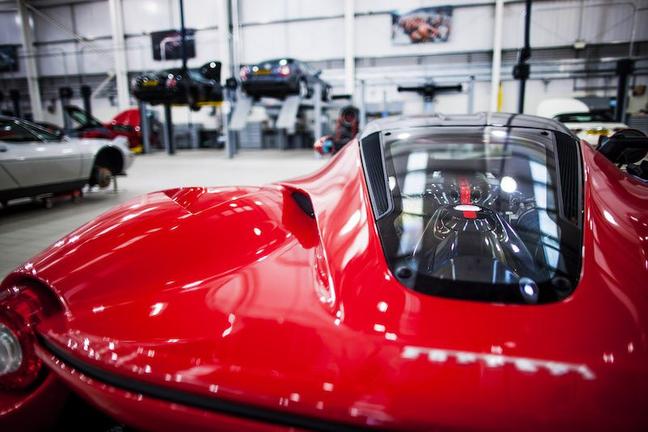 Once through the glass sliding doors, it’s a world apart from the grey industrial estate. Beyond the large prancing horse mounted on the reception desk and, of course, the espresso machine, a freshly-painted shell of a vintage Ferrari 275, hovers above the shop floor on a hydraulic ramp. This is not your average garage.