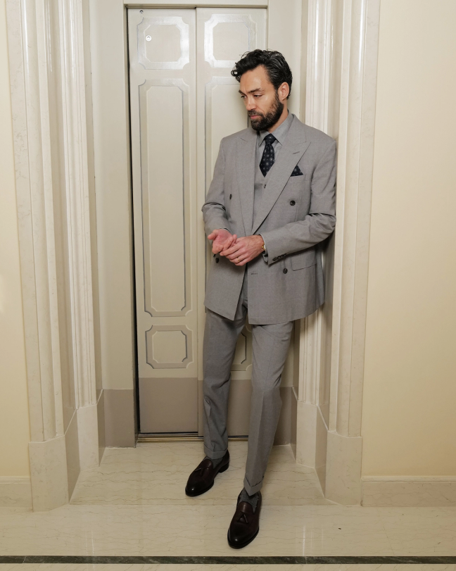 Hassell's outfit for the Dunhill show, which comprises a light grey three-piece suit from the Spring/Summer 2025 collection, paired with brown lace-up shoes and navy details by way of a pocket square and Windsor-knotted tie, had him feeling quite Carey Grant. "I grew up from the age of 15 years old obsessed with the American acting culture," he says, citing Marlon Brando and "Jimmy Dean" as key inspirations. "So my style since then has always been a little 1950s inspired, with a little bit of Beatnik in there, and I also can’t seem to get away from Danny Zuko. I love a white T-shirt with a capped sleeve and a pair of boots. I’m more at home looking like I’ve been pulled through a hedge, but it’s nice to wear something adult that makes me feel good."