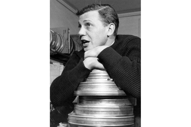 Attenborough leaning on film cans in 1962, when he was head of the Travel and Talks department of the BBC (Photograph: BBC)