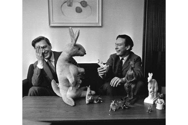 Attenborough and Michael Peacock, controller of the BBC, pose with soft toy versions of Custard and Hullabaloo, the kangaroo mascots used during the Launch of BBC 2 (Photograph: BBC)