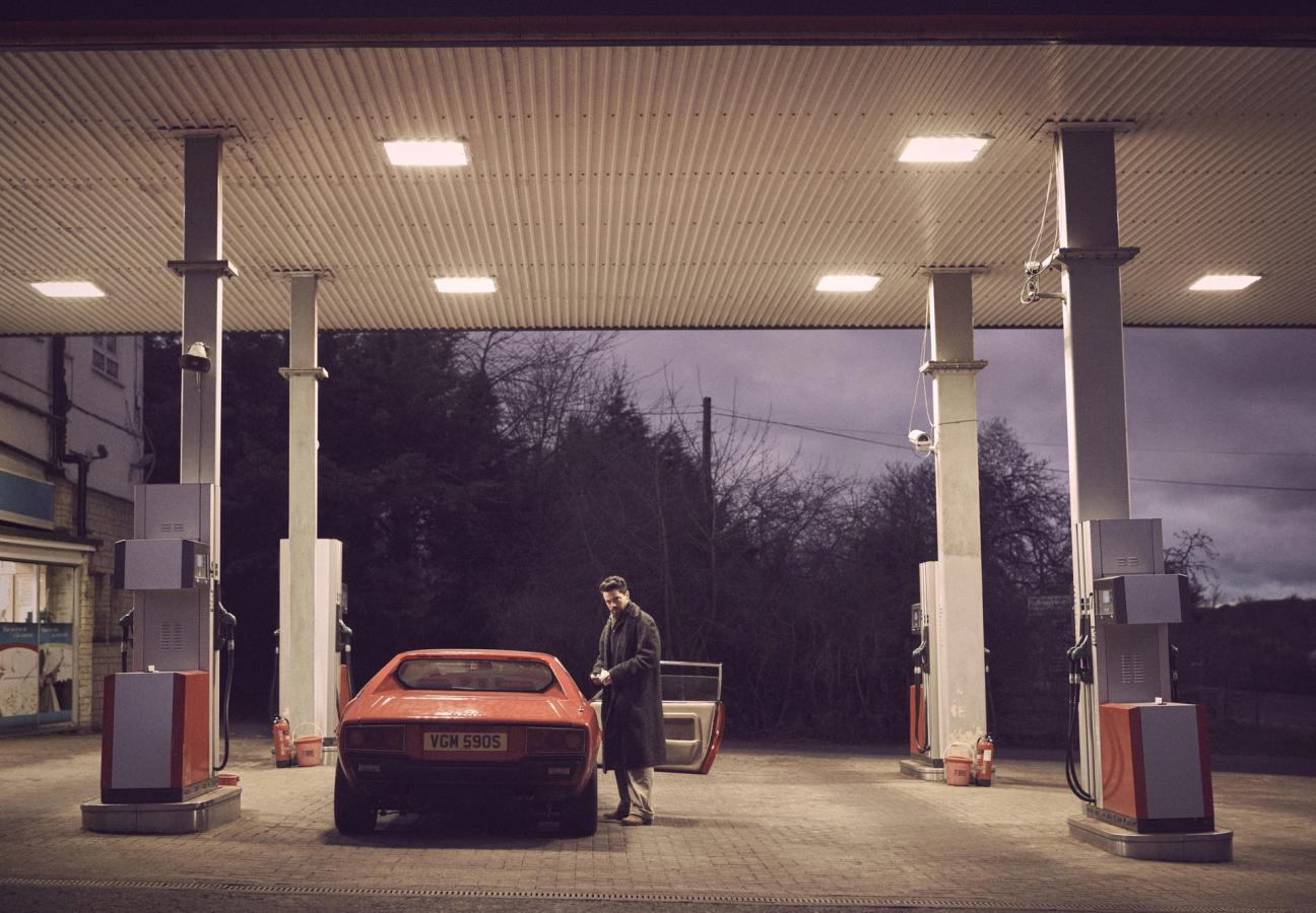 Today, in his newly acquired, villain-red Ferrari Dino 308 GT4, the actor is making off across the English countryside in the latest styles.