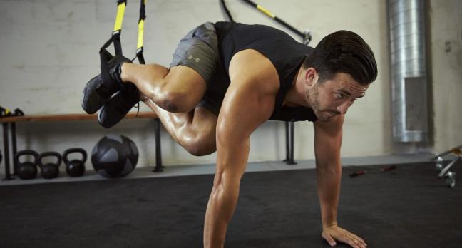 3 x 10reps; From your TRX Plank position bring one leg to your chest, and then do the opposite. Do either a full or half press up to complete each rep.