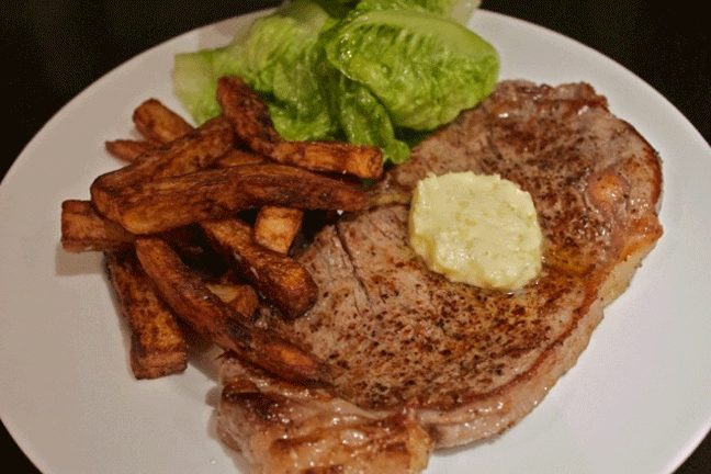 Step 3: When the steaks are surface sealed and brown, transfer them onto a plate and place them into the warm oven with the chips. Add the garlic butter and leave to rest for 5 minutes. Serve with the green salad, chips and a large glass of red wine and enjoy. That’s a steak, just how it should be.