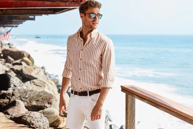 It goes without saying that short-sleeved shirts are not an option here. Forget about it. Choose long-sleeved, fine cotton shirts in stripes and roll the sleeves to the elbows when the sun shines.