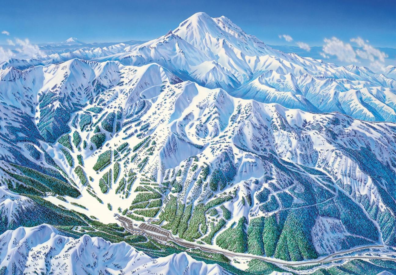 Crystal Mountain, on the other hand, was just the opposite. I had not visited or flown the resort, but was supplied with a single aerial photo of the place. It was pretty much a slam dunk, but I did change a few slopes to get all the runs represented. You have to know when to leave things alone, and not many resorts are this straight on. The scene is incredibly dynamic, with Mt Rainier looming on the horizon. I heightened the effect with some well placed clouds — an example of “romancing” the map. I’ve always felt the beauty of these ski resorts is as important as getting the skier down the mountain. After all, many kids (and adults) have these maps pinned on their walls to dream over.