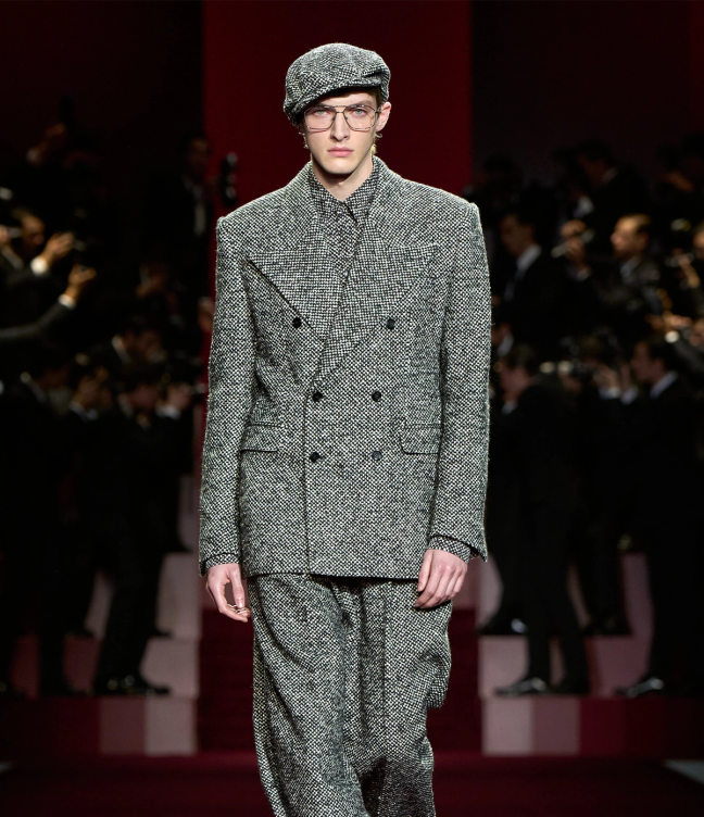 The Autumn/Winter 2025 collection was inspired by Federico Fellini's La Dolce Vita, a film in which the word ‘paparazzi’ was first coined. Tuxedos were adorned with crystal brooches and sparkling buttons, while the rest of the collection gave Hollywood star energy with big fur coats, slouchy Noughties jeans not amiss to those seen on the likes of Jamie Dornan and Keira Knightley, and plenty of A-lister sunglasses. Sophie Jordan, Menswear Buying Director at Mytheresa said "the show was lighthearted and just fun, watching the front row having a good time is also part of the experience. Highlights for me were the brown velvet three-piece suit and the OTT leopard coat."