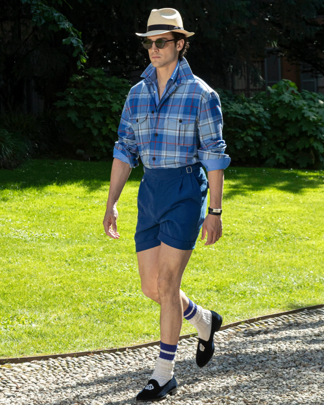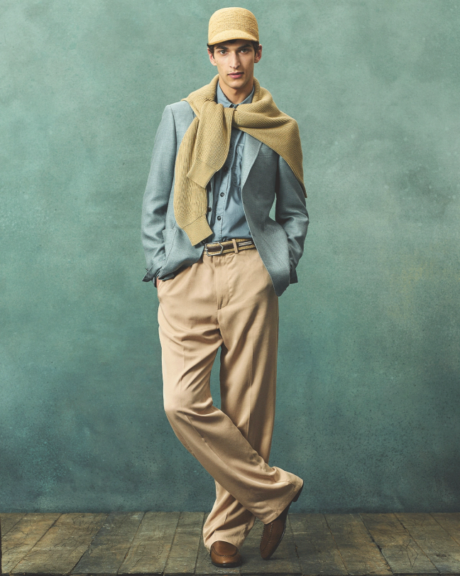 Two-buttoned suits in papaya-tinted Prince of Wales check epitomised Cucinelli’s seasonal collection, and were sat alongside piqué shirts in grapefruit and ginger-toned cotton herringbone blazers. It was a fruity collection, that added a new punch to Cucinelli's summer collections. Tuxedo jackets in suede lambskin and flowy silk-cashmere trench coats gave light outerwear offerings, while huarache-style sandals seemed destined for warmer climes. Meanwhile Cucinelli got sporty, as if heading to Cap Ferrat or beyond, with sunshine-drenched capsules dedicated to golf and tennis.