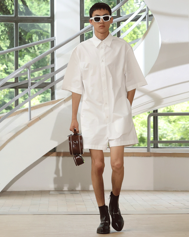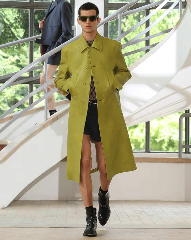 Gucci invited guests to Trienniale Milano to highlight the need to protect the oceans. Sabato De Sarno's sophomore menswear collection for the brand was heavy on the sealife motifs, with garments embossed with prints of surfers, dolphins, and banana leaves. The Horsebit, which De Sarno seems to love, was ever-present, featuring on loafers and boots alike. Layering was key, with green leather coats masterfully worn over barely-there shorts, while printed jackets and matching shirts were also worn with cut-offs.