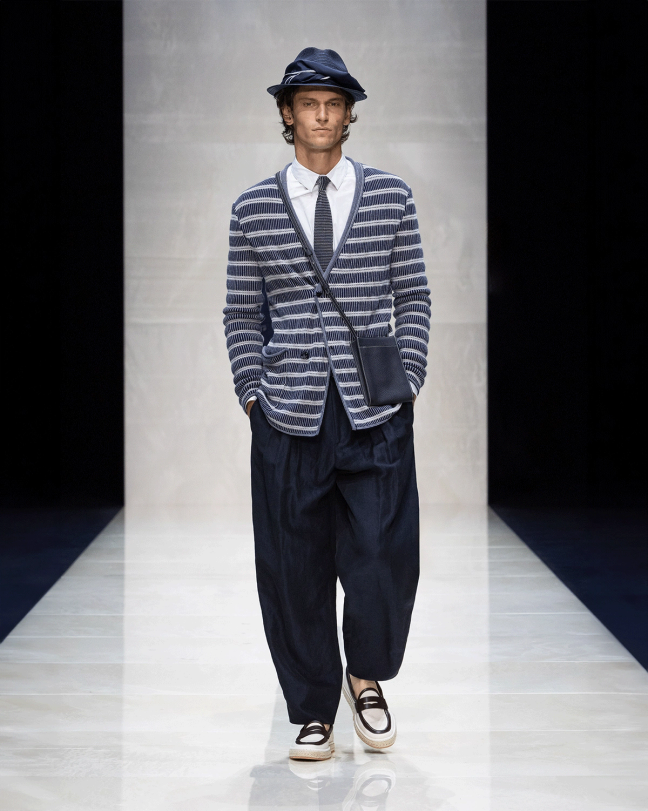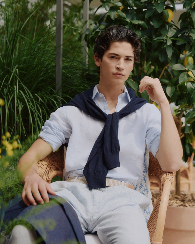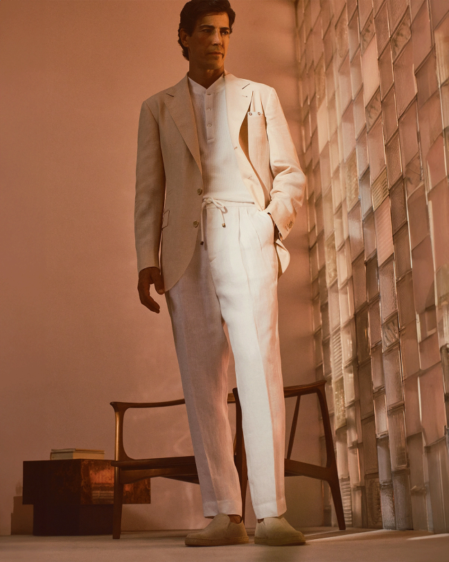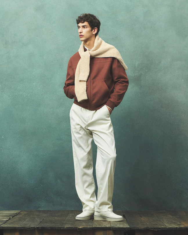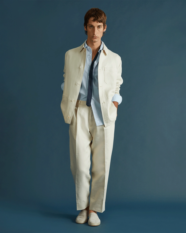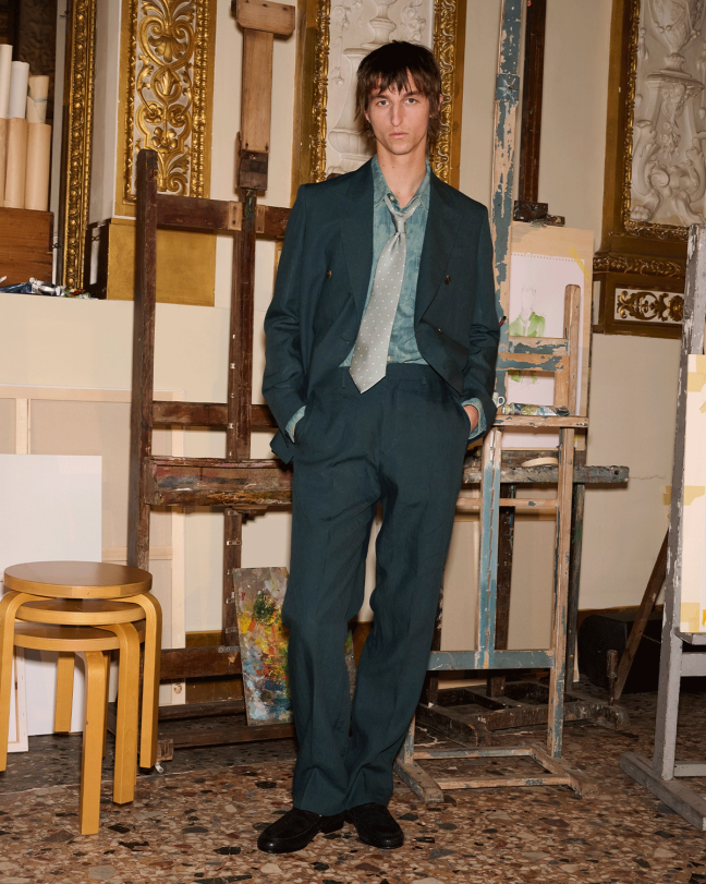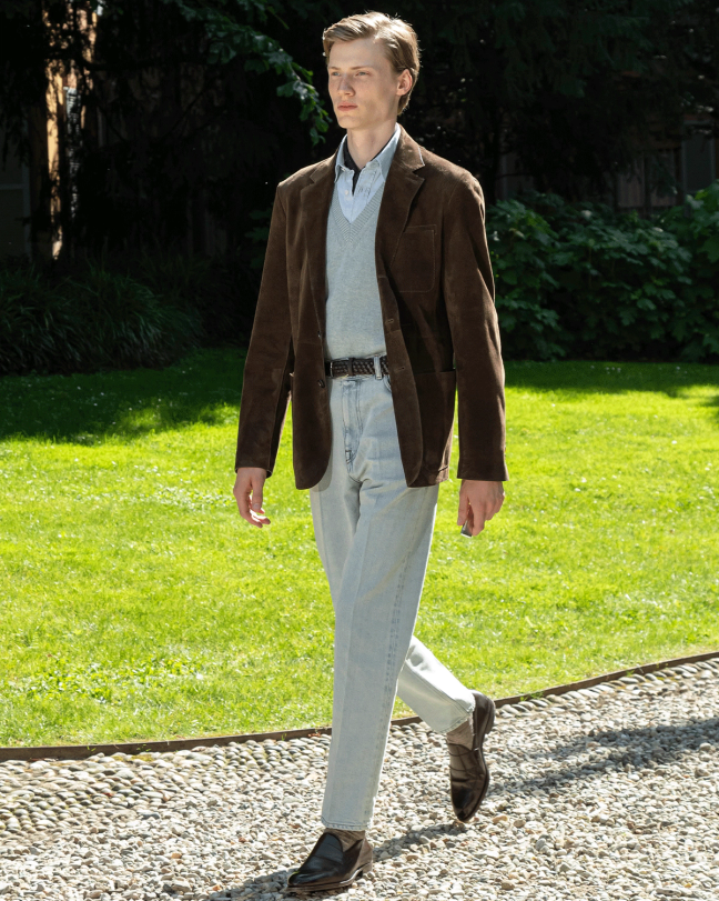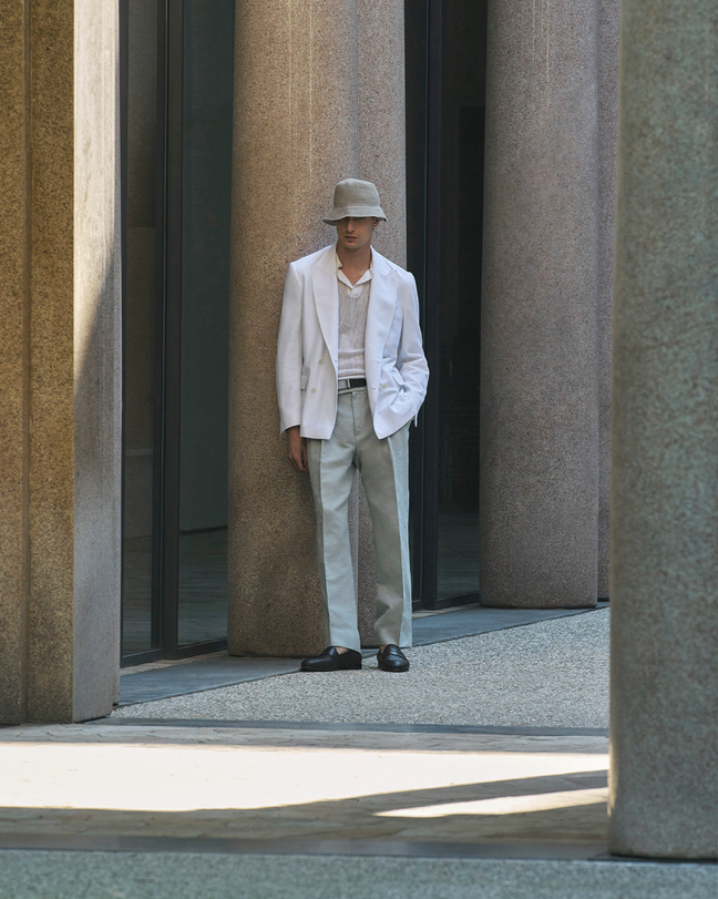 Canali's Spring Summer 2025 collection was a reflection of days spent by the lake. While staying true to the brand's tailoring, the collection was more relaxed than before, with blousons and field jackets loose in manner. Suiting was hollowed out, while maintaining a defined shoulder, while shirts were extremely light in construction. Fine wool, textured linen, nappa leather and silk made up the majority of fabrics used.