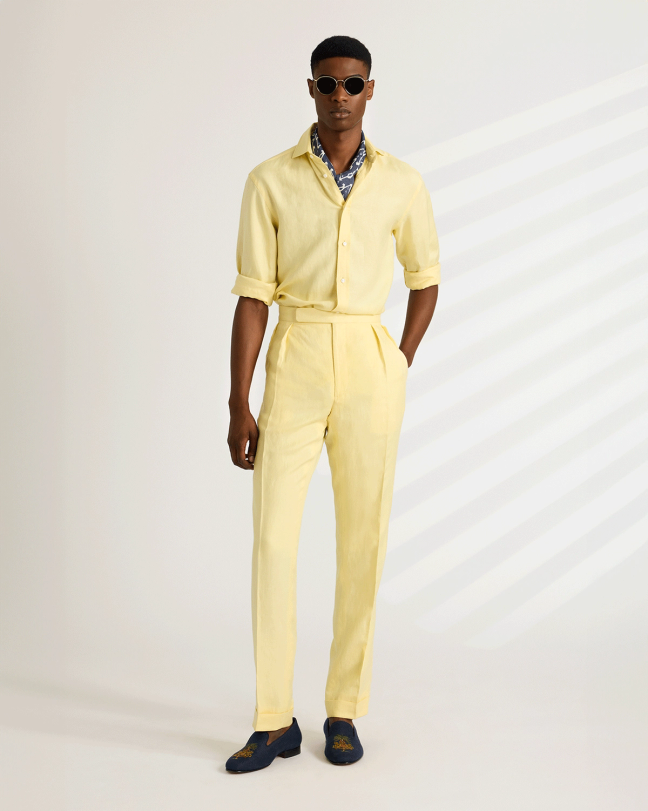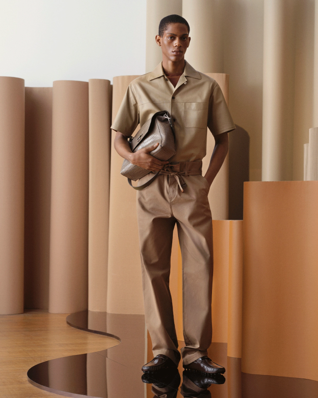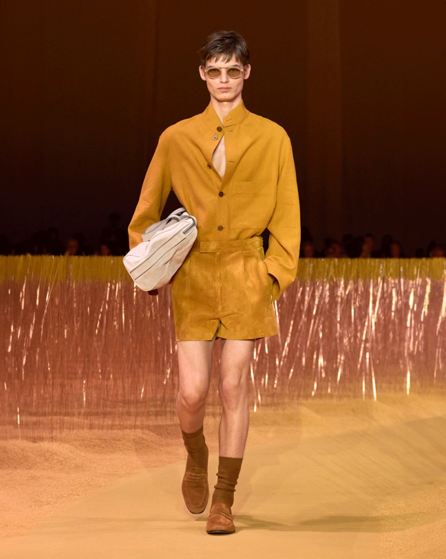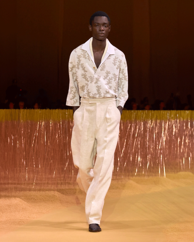 "Us, in the Oasi of Linen" was the name of Zegna's Spring/Summer 2025 collection. Artistic director Alessandro Sartori created a showspace that looked as though blades of linen – constructed from strips of metal – were invading the industrial space where the show took place. Earthy hues of terracotta, beige and yellow were the solid foundation for the collection, which was, as you'd probably guessed, crafted largely from linen. Models, including Mads Mikkelsen, were draped in baggy trousers, supple leather jackets and super soft collarless shirting.