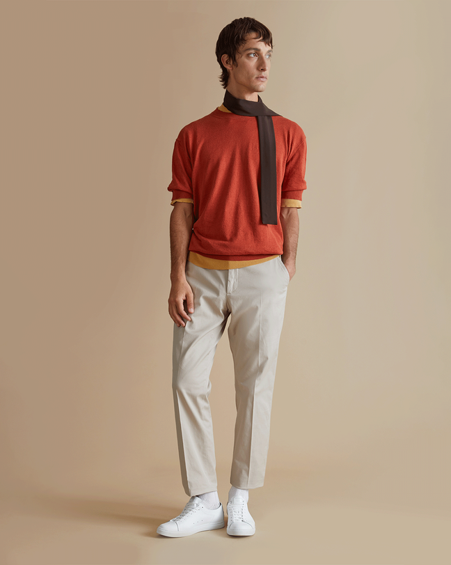 Slowear's collection was designed for the modern man whose life blurs office culture and relaxing by the sea. Chinos were rolled up, collars were popped and T-shirts come knitted. Tailoring is louche and relaxed, while shirts were left unbuttoned.