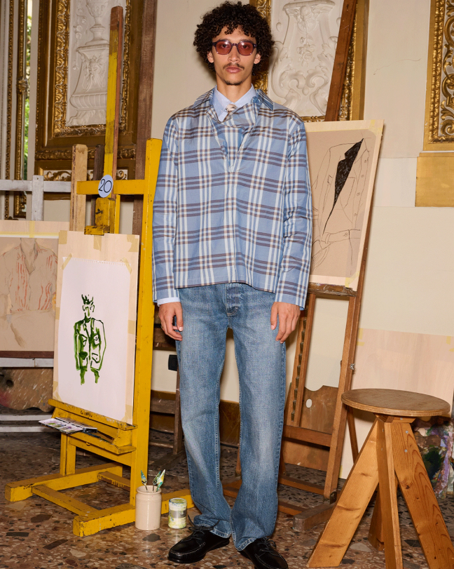 Paul Smith landed in Florence and presented his Spring/Summer '25 collection at Pitti Uomo. It was the first time he was showing there after 31 years and he presented a louche and tactile approach to tailoring. Ties were loose, denim chore jackets were used where traditionally blazers would be and unstructured blazers came in cotton canvas. Francis Bacon and Lucien Freud provided key influence, with Smith wanting to reflect the vibes of London's Soho (they both frequented it) and suits were cut from classic houndstooth and Prince of Wales fabric.