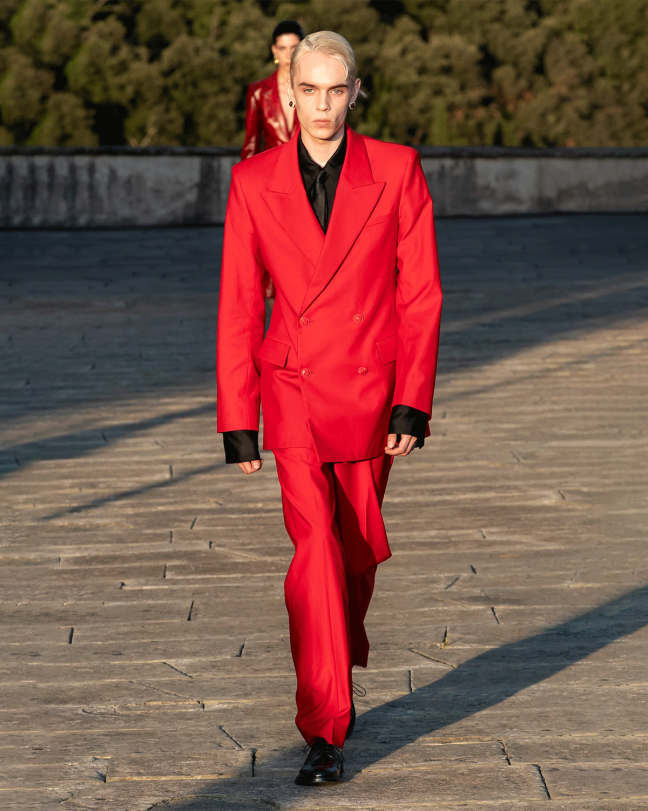 This season Brioni tried something a little different. While sticking to its expertise in fabrication, trousers were more high-waisted, and larger lapels added more volume to the lowkey looks so synonymous with Brioni. Luxury came in the form of a windbreaker in technical silk with leather details and a crocodile jacket, while extra-fine wool double-breasted suits were for the guy who is serious about his officewear.