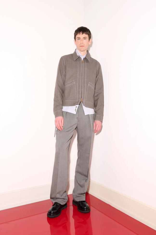 The collection comprised the easy-to-wear clothing that has made the brand a success since its launch in 2011. Oversized, work-ready checked jackets, slouchy suits, blazers worn under parker coats, plenty of neck ties and thick-soled loafers made up the collection, while an autumnal colour palette of warm amber, bronze, olive green and black felt appropriate. Accessories-wise Mattiussi presented an array of man bags in all shapes and sizes. Notable was the introduction of the Mimi, its latest model, named after an endearing French term meaning both cute and small.