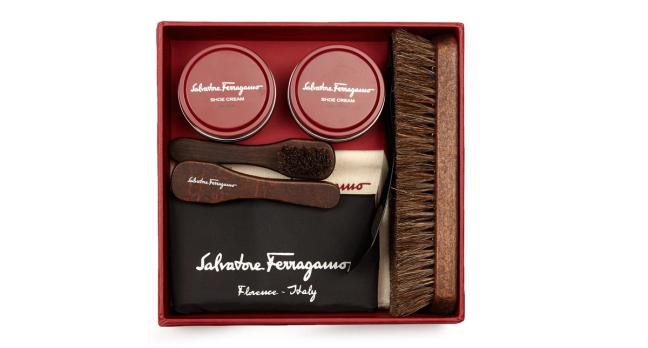 Italian shoemaker Salvatore Ferragamo’s shoe care-kit contains everything a gentleman needs in order to keep his favourite shoes in pristine condition. With black and brown polish, dark-wood horsehair brushes, a polishing cloth, and shoe horn, the kit also contains a handy dust bag to protect your shoes when travelling.