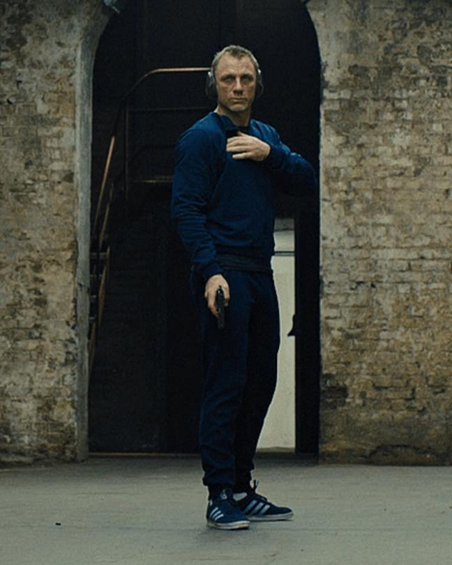 Unlike the tactical stuff that Craig sports in No Time To Die, the Skyfall trainingwear has a soft edge about it, as it comprises a track jacket credited to Puma – complete with a zip-front and a classy MI6 insignia on the left breast – a long-sleeve crewneck T-shirt and trousers (though not explicitly attributed to Puma, we can take an educated guess that the label was involved with these pieces), and Adidas Gazelles. When kitted out in this sleek ensemble, Craig’s Bond is made to run on a treadmill, do a few sit-ups and pull-ups, prove his shooting ability, and is subject to psychoanalysis.