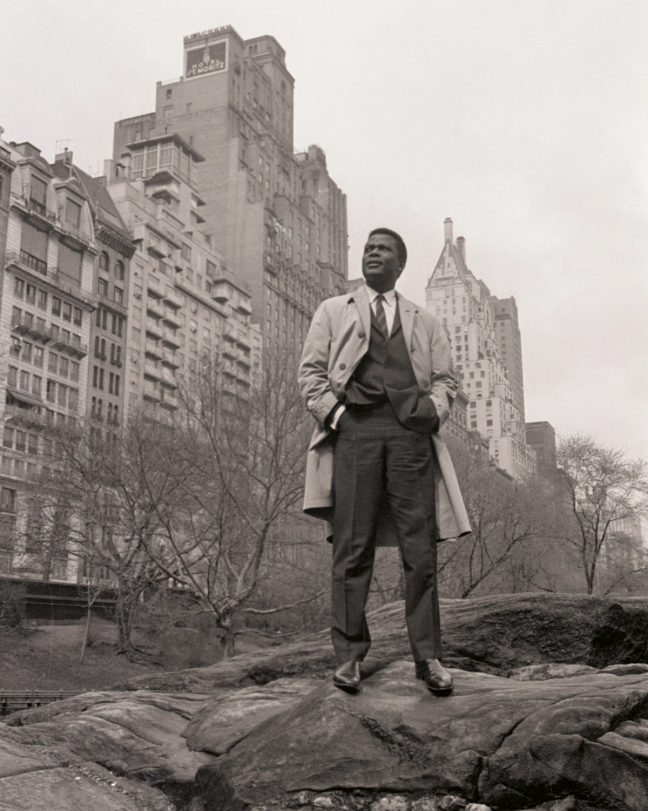 It’s April 1964, and Sidney Poitier is both on top of a cluster of rocks in Central Park (as pictured) and on top of the world, following his Academy Award win for Best Actor — the first in the category awarded to a Black actor — for his role in the comedy-drama Lilies of the Field. “Up to the stage came the most elegant man I had ever seen,” recalled OprahWinfrey about the time when, as a 10-year-old watching TV, she saw the actor collecting the gong in a black tux jacket and white bow tie. Poitier largely drew attention for his understated but well-tailored ensembles — his ability to pull several layering pieces into a coherent whole was also key to his appeal. Which is where we return to the photo at hand, in which both notions come into play: here, we see a stretch of Manhattan apartments providing a backdrop for Poitier to pose against, triumphantly, weeks after his win, in a multi-pieced look where several contrasting details — striped tie against block colours, the light hue of the mac over a dark two-piece suit — provide numerous points of interest.