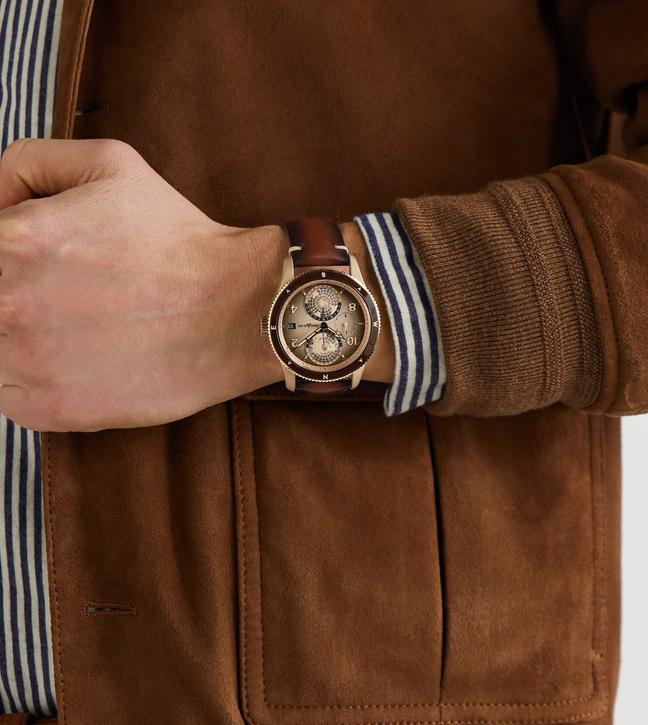 Featuring a sandy smoked brown and beige dial, it certainly still looks like a 1858 Geosphere — retaining the dual times zones, northern and southern hemisphere globes and 24-hour scale. But, with its bronze case, brown leather strap and dusty decorations, it’s a whole new design direction for enthusiasts to explore.