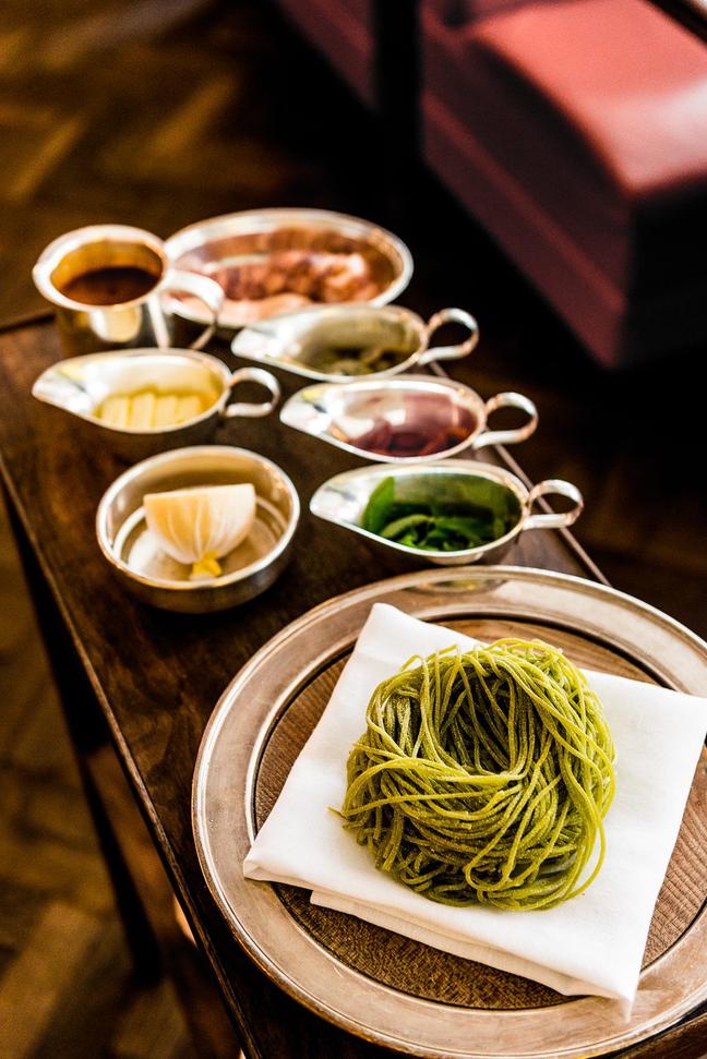 But perhaps Fortnum’s greatest contribution to the culinary scene can be found attached to the back of the department store — albeit with a separate entrance; a heady whirl of pastel greens and orange leather casting a delectable foody spell over the streets of St James’s. This is 45 Jermyn St, and it is one of the most eccentric, exclusive restaurants in London.