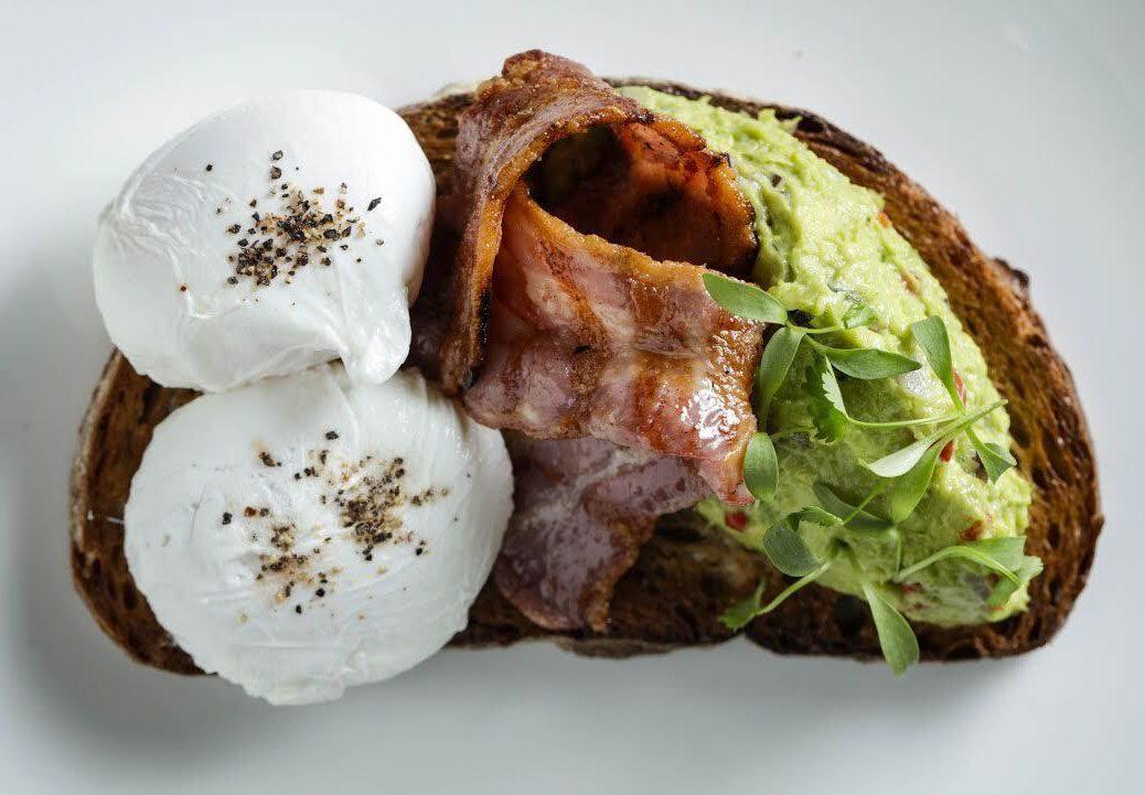 Poached eggs, crushed avocado, streaky bacon, grilled sourdough