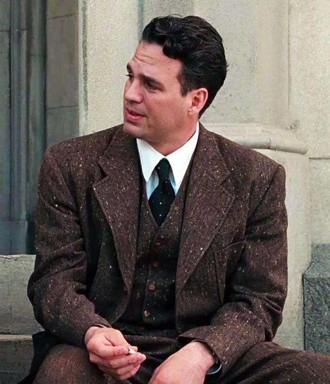 Just look at that dark brown, Donegal tweed suit. It’s three pieces of pure, handsome style. Paired simply with a white shirt, similarly spotted tie and a cigarette, Ruffalo’s got an air of unruffled cool about him and a classic collegiate style that, once more, offers something other than a Goodfellas-black, double-breasted suit in Scorsese’s oeuvre. And, for that distinction, it must be applauded.