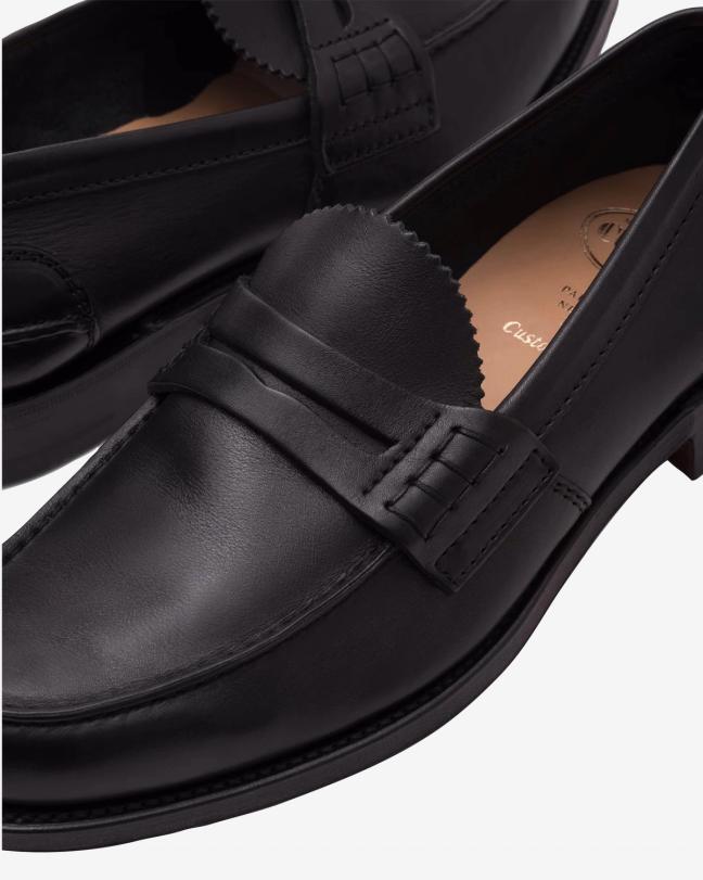 Grenson's Simeon style is a lightweight gathered apron moccasin, cut from soft black nappa leather. Another penny loafer in design, it has flexible leather sole that fits your foot like a glove, resulting in the ultimate comfort.