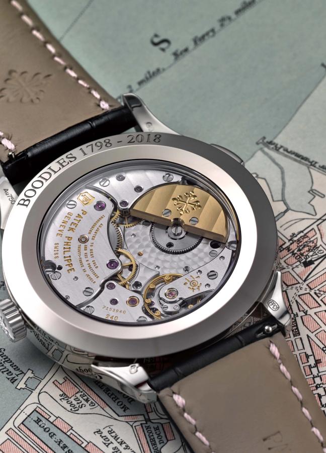 Patek Phillipe’s in-house World Time movement shown through the sapphire case back