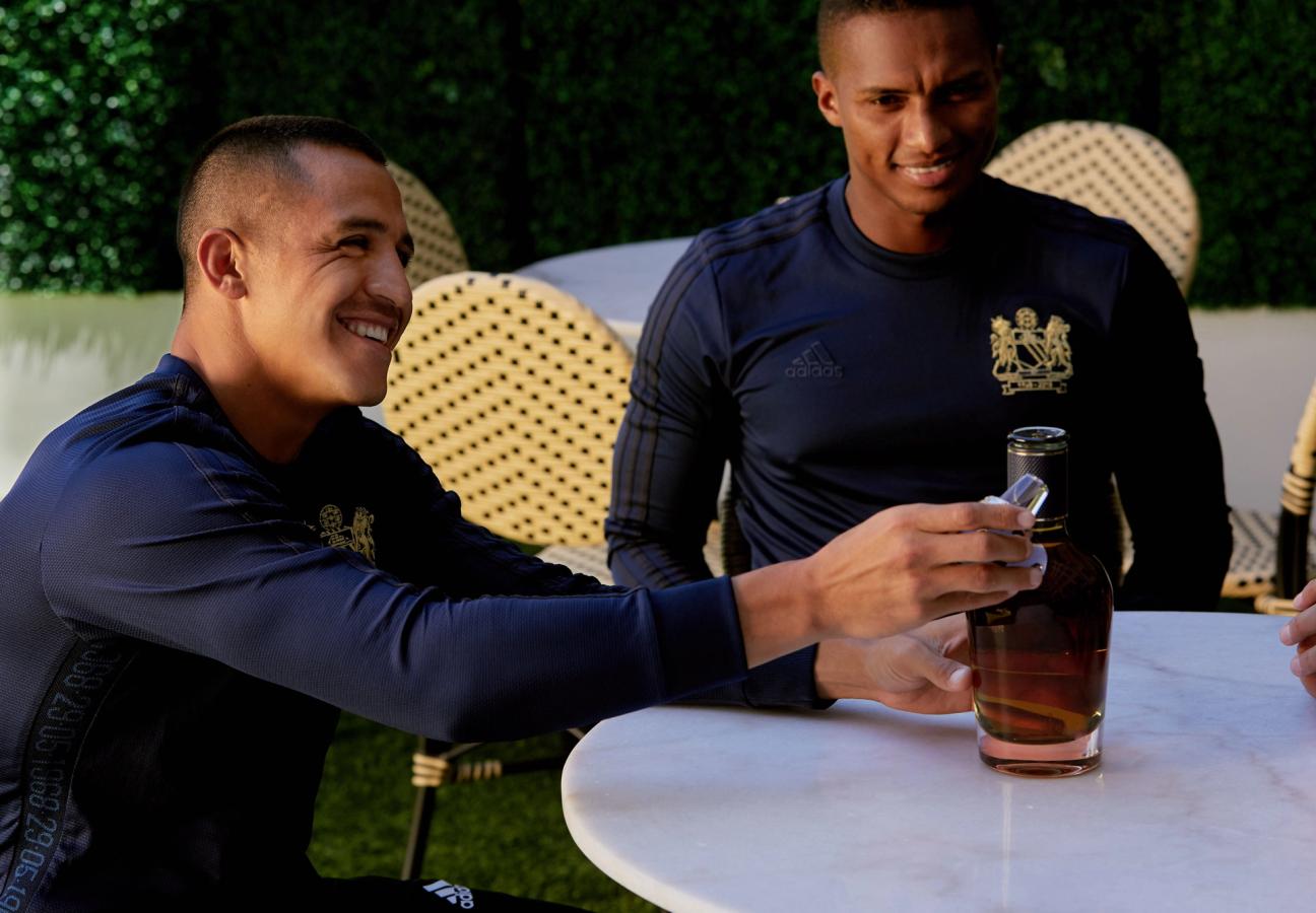 Alexis Sanchez and Antonio Valencia with a bottle of Chivas The Icon 50th Anniversary Limited Edition whisky. Photographer: Monroe Alvarez