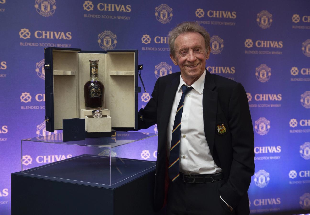 Manchester United Legend Denis Law speaks to guests at the launch event for Chivas 50 year old Scotch Whisky.