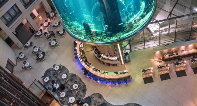 The Blu also has one very interesting feature you won’t want to leave Berlin without seeing. In the foyer of the hotel there is an enormous multi-storey aquarium tower which stands over a bar and illuminates the interior of the hotel all night. It is really a sight to behold.