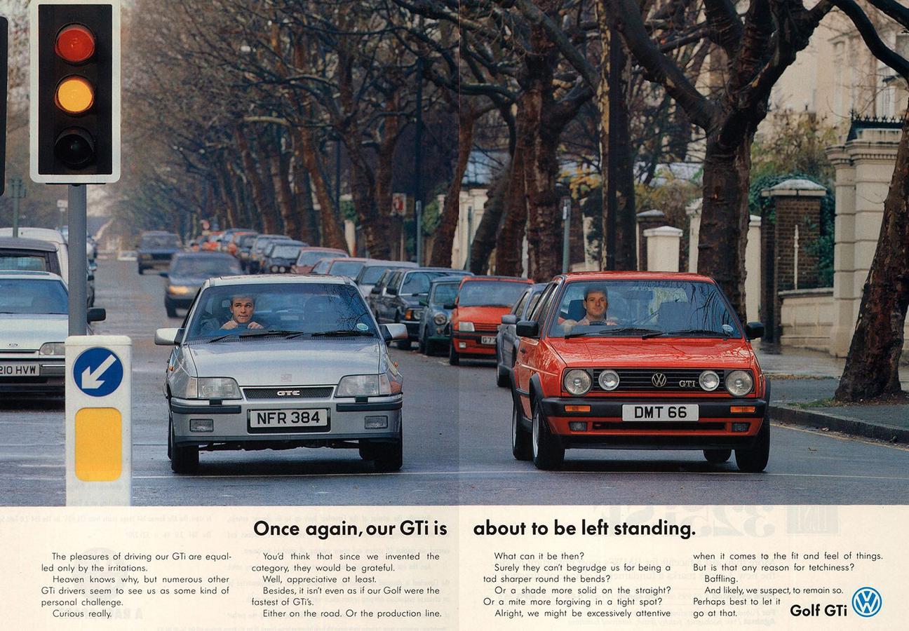 So let’s wrap up with one of the last adverts that Volkswagen ran for the Mk2 GTI. A one-page print advert, it shows a Tornado Red GTI sitting waiting at the lights beside a Vauxhall Astra, and goes on a self-aware, playfully tongue-in-cheek rant about all of the other cars to borrow the ‘GTI’ title.