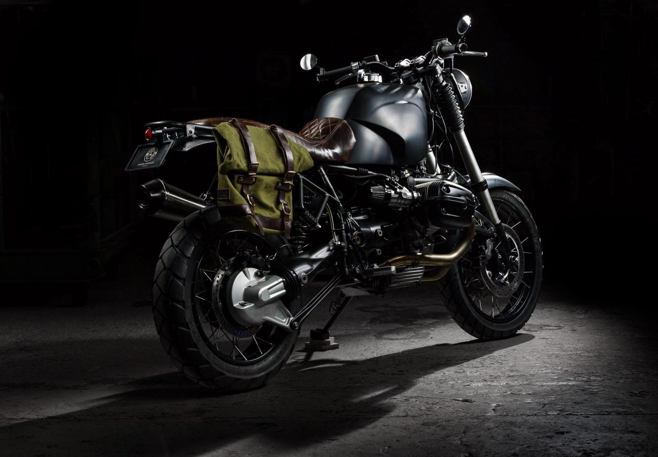From the nuts and bolts to washers, bushing and bearings, each individual worn component on the bike was stripped off and replaced with original BMW parts. On the aesthetic side, a recycled military waxed cotton luggage bag from Unit Garage was added, and the seat was reupholstered with luxurious heavy leather, diamond-stitched by custom seat house Via Meccanica.