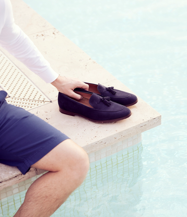 One of our favourite options in this easy, breezy set is the ‘Antibes’ model, which is defined by its sleek, sharp silhouette and decorative tassels, and comes in two options: an ‘ocean’ calf suede; and new milled calf in a rich chestnut hue. As with the other options in the collection, this design has been made on Crockett & Jones’s newest last (No.393), which allows for a refined toe shape, including a shallow-yet-soft toebox, and a superlative fit around the feel. For leisurely strolls around the marina and docks, we recommend pairing with a linen shirt and some well-tailored shorts.