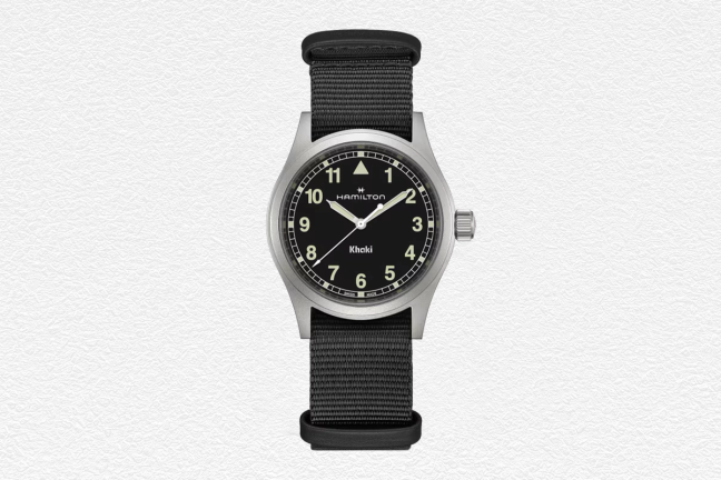 Perhaps one of the most recognisable field watches on the market, the Hamilton Khaki Field Quartz takes inspiration from its elderly relative, the Hamilton G.S. (General Service), that adorned the wrists of non-military British government personnel in the 1960s. Now in both 33mm and 38mm references, the Khaki Field Quartz shares the same unrivalled sturdiness as its forefather, and its NATO strap and uncluttered dial ensures it’s primed for the briefing room, or the boardroom.