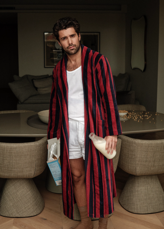Derek Rose dressing gown, £185, derek-rose.com; Sunspel vest, £39; boxer shorts, £45, both sunspel.com; New & Lingwood socks, £25, newandlingwood.com