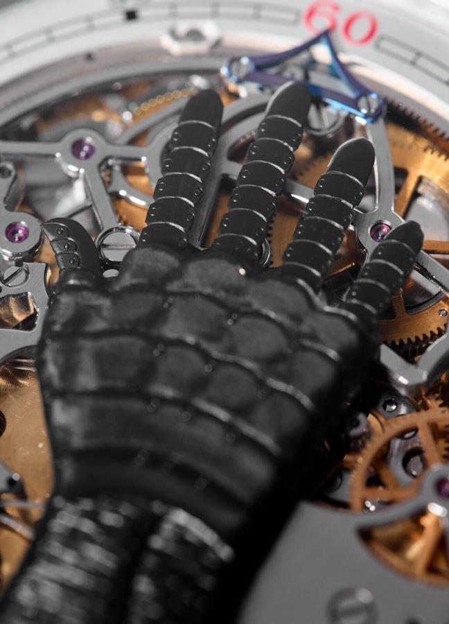 Rendered in metal, the dial’s hand — an archetypal automaton — gives the watch a distinctly retro-futuristic, steampunk character. Overlapping plates and exposed screws recall medieval gauntlets as much as industrial machinery. To animate it, Journe adapted his Octagon calibre 1300.3, refining the movement over seven years until it achieved the desired effect within a remarkably slim profile of just 8.1mm.