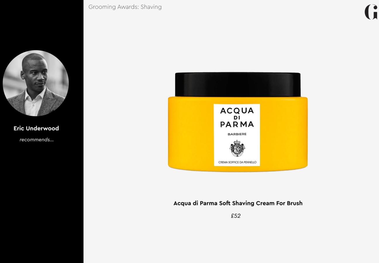 Eric Underwood is the only expert judge to choose a pre-shave product as his winner in this category. The American British ballet dancer has plumped for Acqua di Parma’s Soft Shaving Cream for Brush — a cornerstone of the Italian brand’s vividly hued Barbiere collection. In his words, here’s why it won: