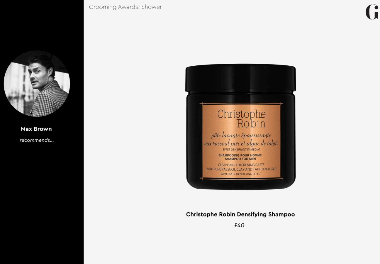 Max Brown has opted for a straight shampoo. Ideal for men with fine or thinning hair, this Cleansing and Thickening Paste and Shampoo from Christophe Robin looks to be the perfect shower product — if not for the fact it comes in a jar rather than an easily-squeezed bottle. Here’s why it topped the list for Brown: