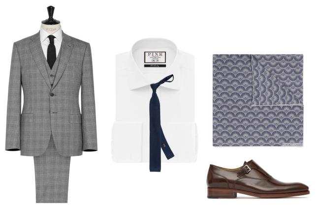 Wool 3-piece suit, £495, reiss.com, double-cuff shirt, £90, thomaspink.com and knitted silk tie, £70, thomaspink.com, silk pocket square, £70, turnbullandasser.co.uk and leather monk strap shoes, £250, reiss.com
