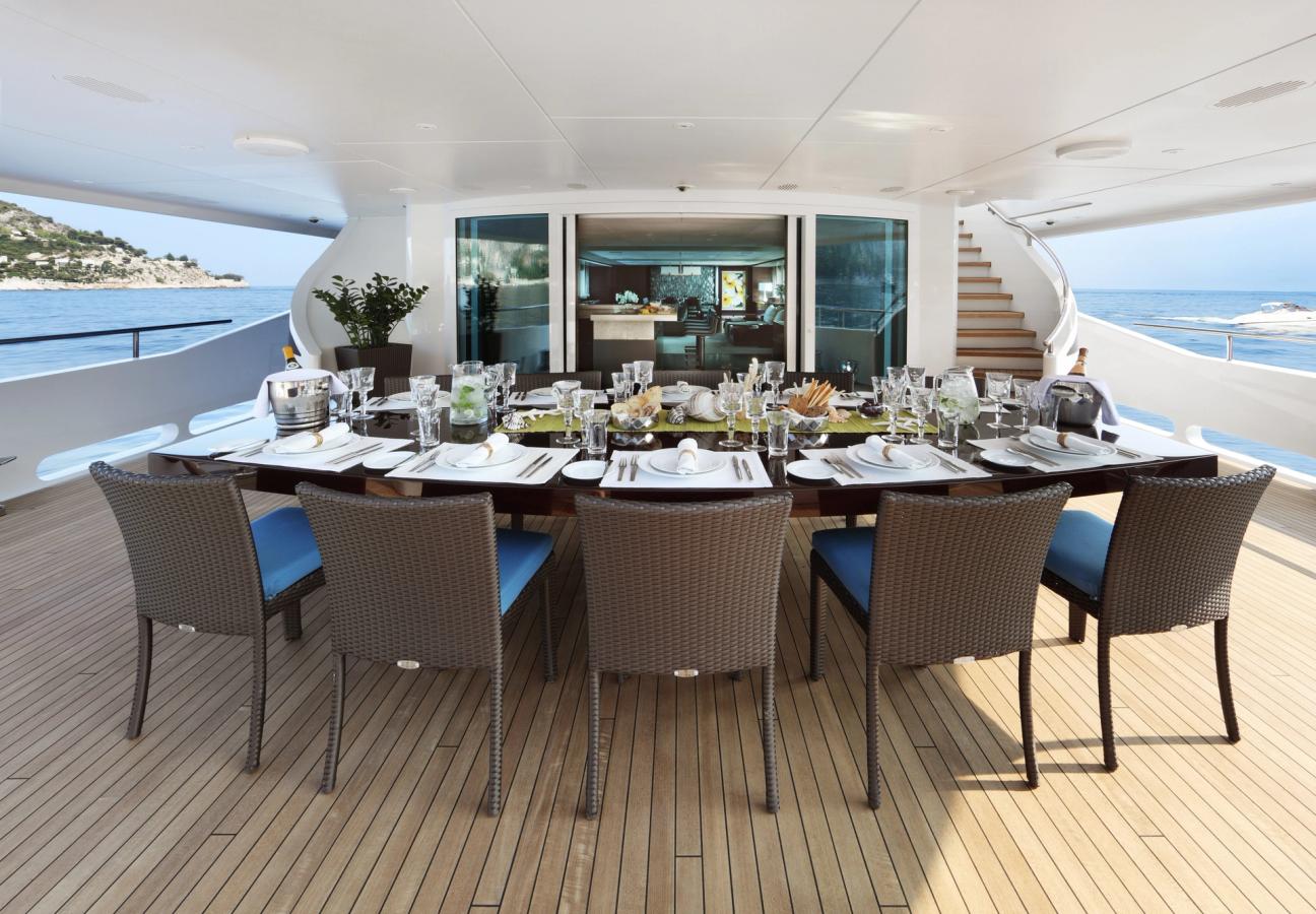 Step aboard Inception, and you’ll find that her effortless style extends into the interior, thanks to design by Omega Architects. An elegant combination of rich woods, Murano glass walls and fine silk coverings allows the superyacht to feel at once effortlessly cool and charmingly intimate. And you’ll want for nothing once on board, with an award-winning 11-person crew on hand to cater to your every need.