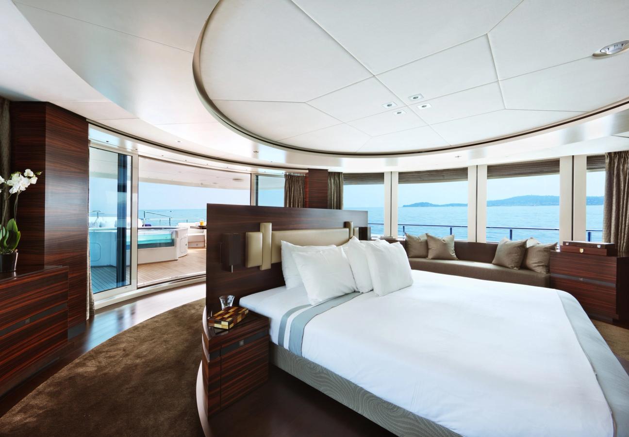 Inception can cater for up to 10 guests. By day, the huge sundeck boasts a 12-person Jacuzzi and quadruple sunpad to lounge in the sun. At night, the bar (with tiger’s eye lacquer finish) and dining area are set under a retracting sunroof and illuminated by micro starlights.