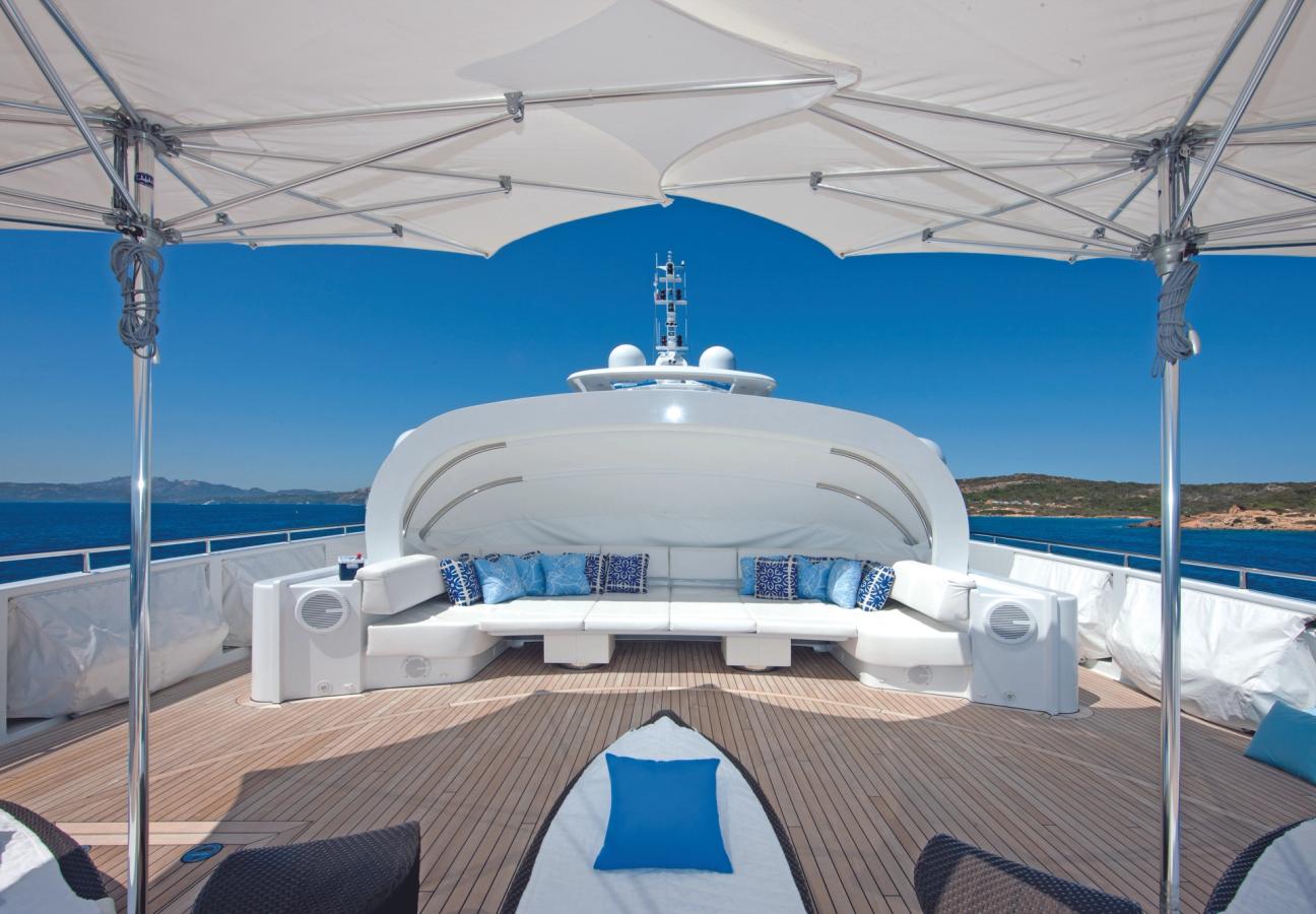 The foredeck has a teak terrace and clamshell awning that provides shade and can be converted into a cinema — perfect for, say, a Christopher Nolan screening.