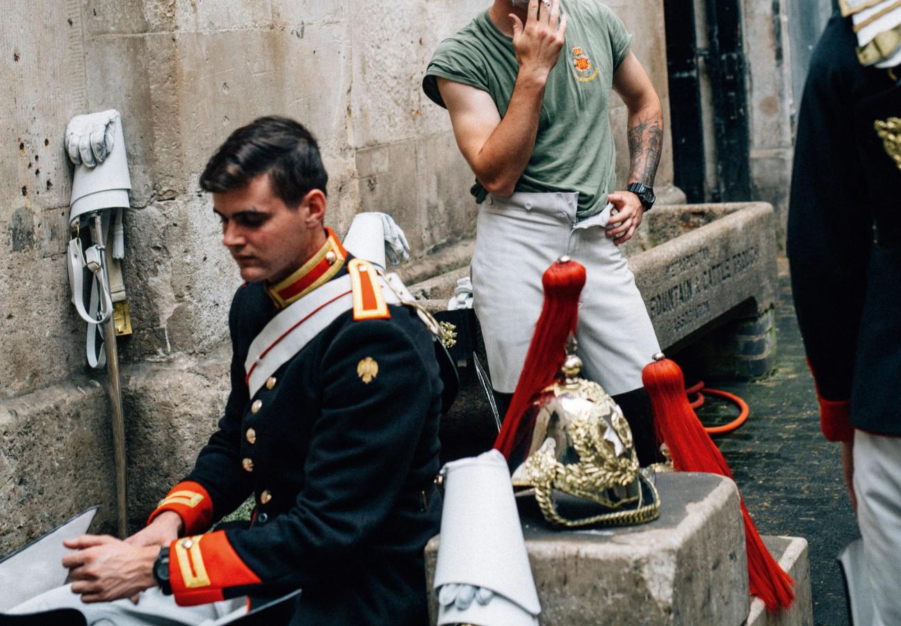 A typical day starts at 6am with the Watering Order, an hour-long exercise through the streets of London for horses and riders not on the King’s Life Guard that day. At 10am, after breakfast, those on the King’s Life Guard line up to be inspected, before moving off at precisely 10.28am to Horse Guards, passing under Wellington Arch en route, in full ceremonial kit.