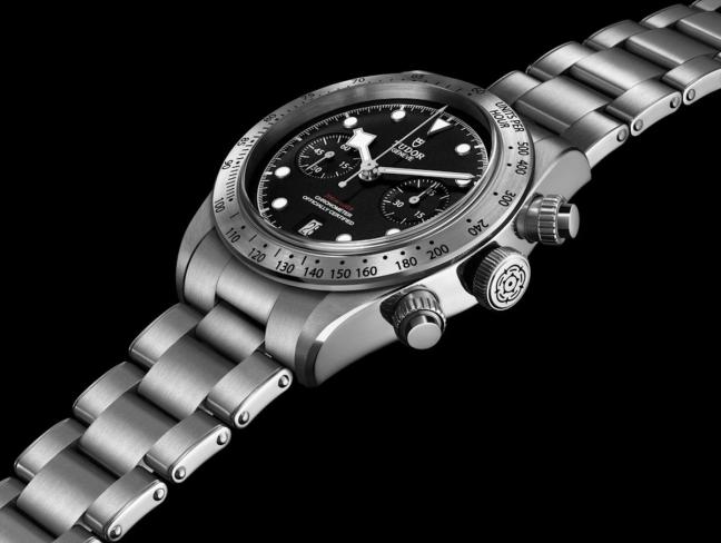 As the first chronograph in the Heritage Black Bay collection, highlights include the iconic snowflake hands, an over-sized screw down crown complete with the Tudor rose engraved and lacquered in black and a high-contrast dial for optimum readability in all conditions. A fixed bezel in circular satin-brushed steel with an engraved tachymetric scale completes the racing look. Inside is the Manufacture chronograph Calibre MT5813, a chronometer certified automatic movement featuring a column-wheel with vertical clutch and offering 3 days of power reserve.