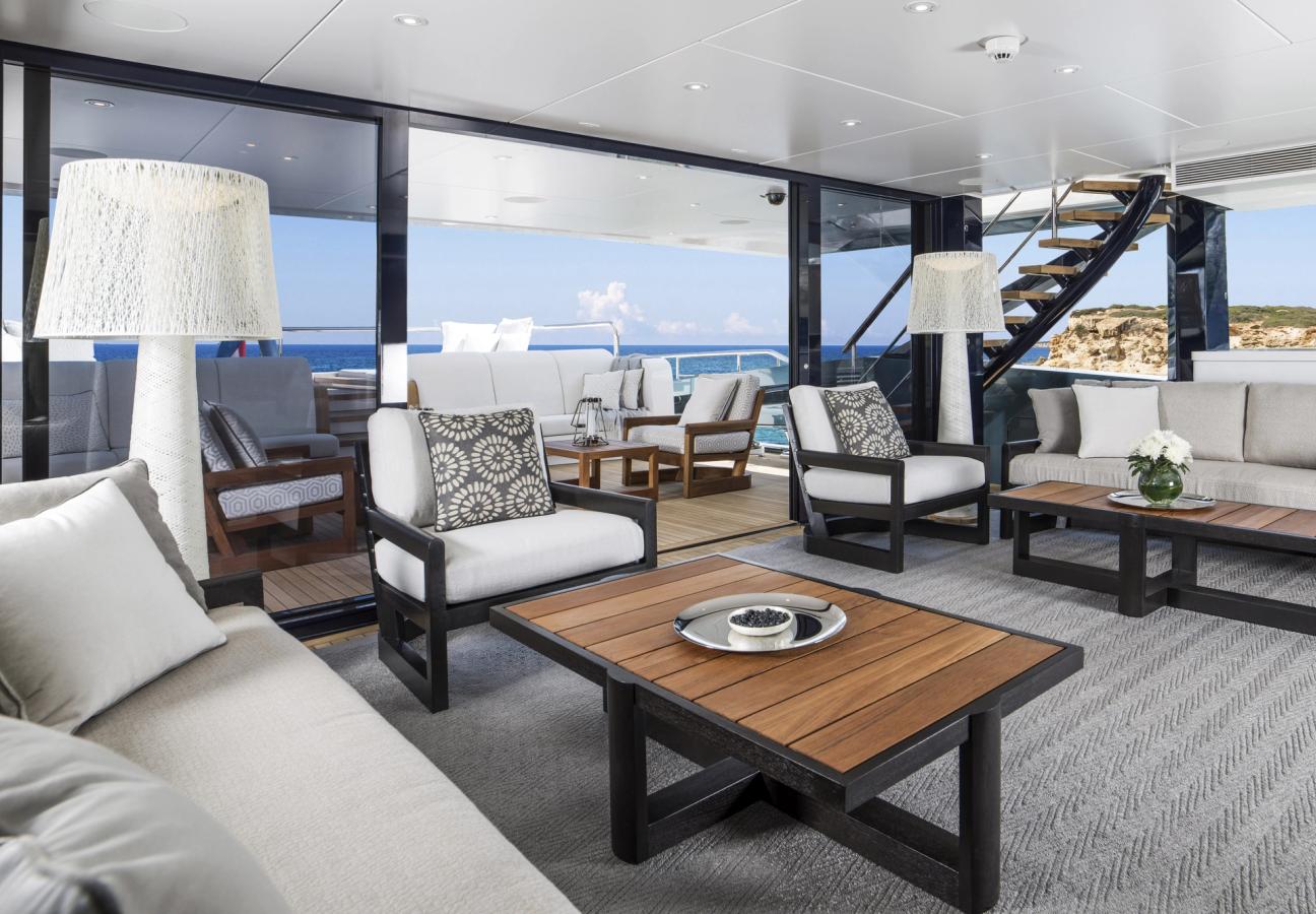 The innovation continues in the smaller touches, too. On the main deck, a built-in bench seat is protected by a hydraulically driven canopy that creates a wind-sheltered outdoor space ideal for relaxing. And, at the rear, a fold-out stern door makes it easy to launch the Compass tender and transforms into a superyacht beach club simultaneously.