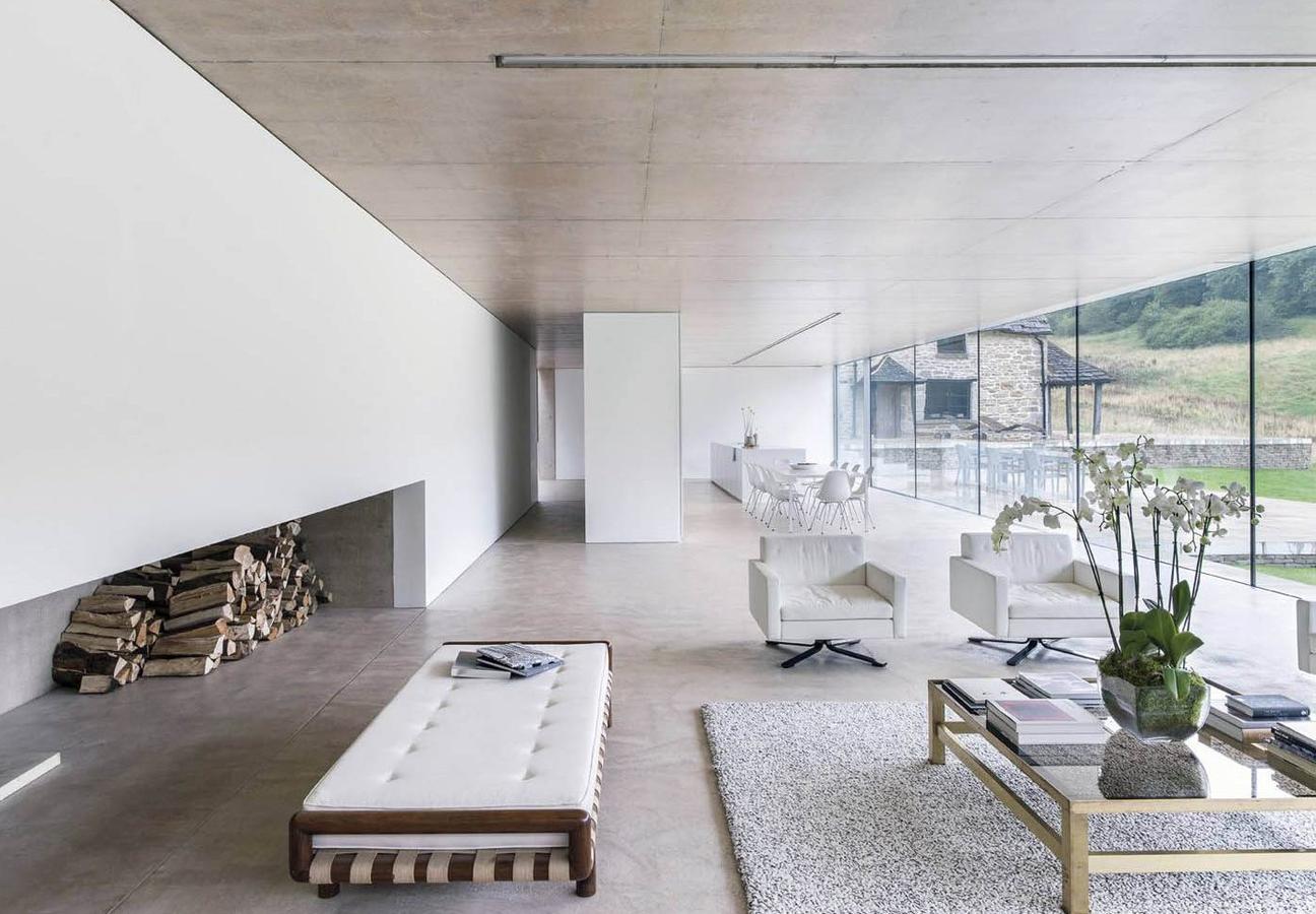 The minimalistic interior – from its palette of whites and stonewashed tones to the sweeping glass panels which allow light to flood in – also gives the house a natural vibrancy, while the green roof over the pavilions is designed to help the structure blend in seamlessly into its surrounding landscape. The result? A stripped-back (yet worldly) escape which proves that a minimalistic approach to design can often make the biggest impact.