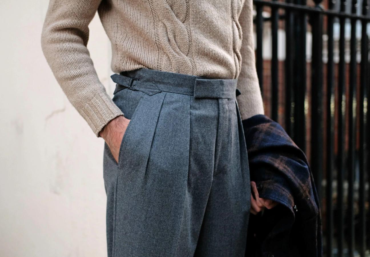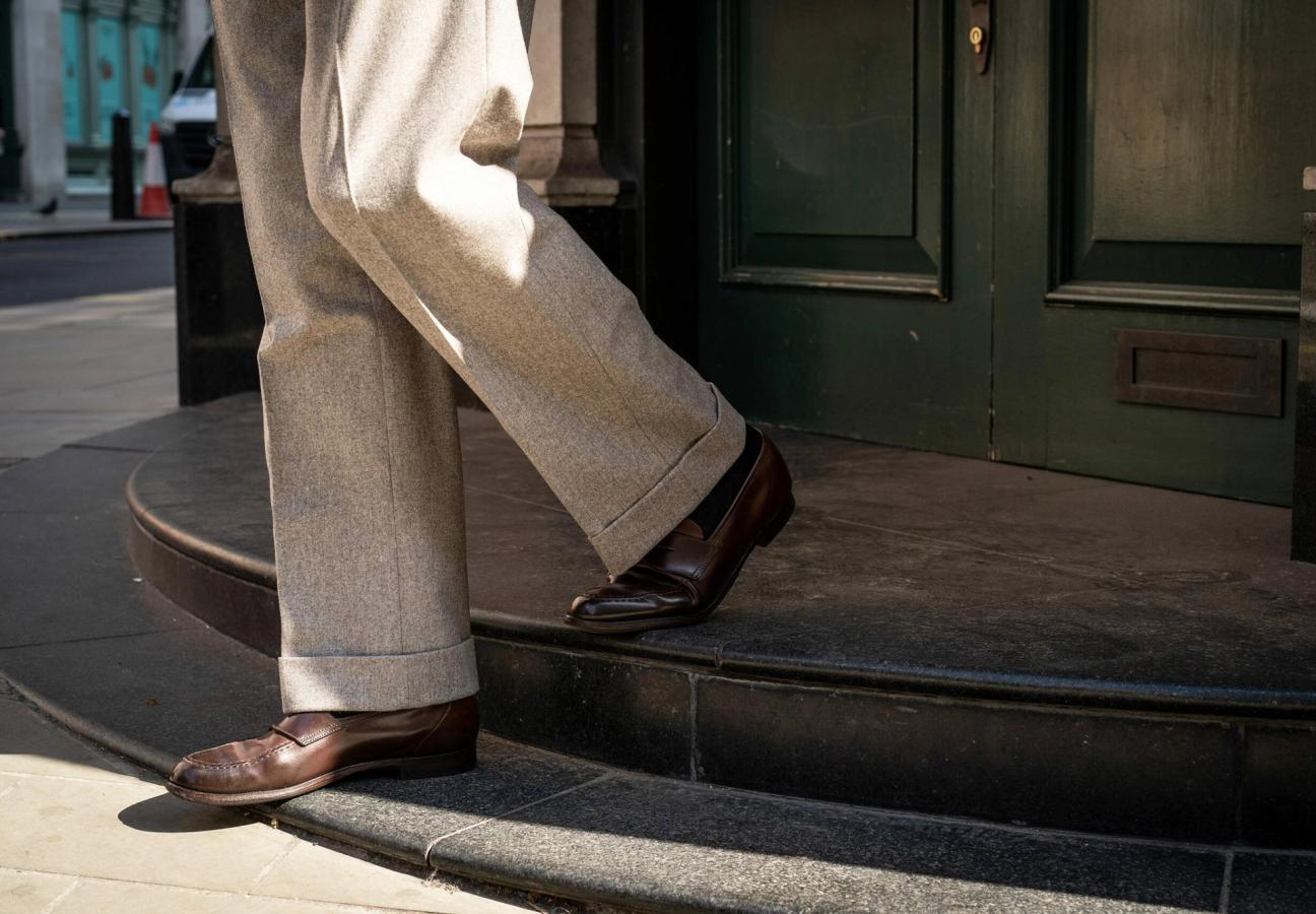 First up, the ‘Grant’ style. Perfect for more wintry weather, this design was developed using more rigid materials; cloths with less drape, such as cotton, linen or tropical worsted wool. But we’d opt for flannel at this time of the year — a fabric that wears the deep double pleats and pronounced taper of these trousers exceedingly well.