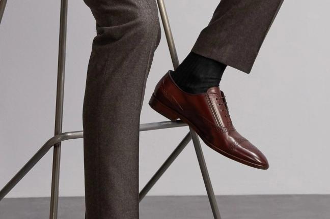 Next up, turn to the type of socks you should be wearing. Darker colours are always advisable, although a subtle stripe or texture is always encouraged. You should always attempt to match your socks, be it tonally or colour-wise, to your trousers. Never set out trying to match your socks to your shoes – unless they’re black.