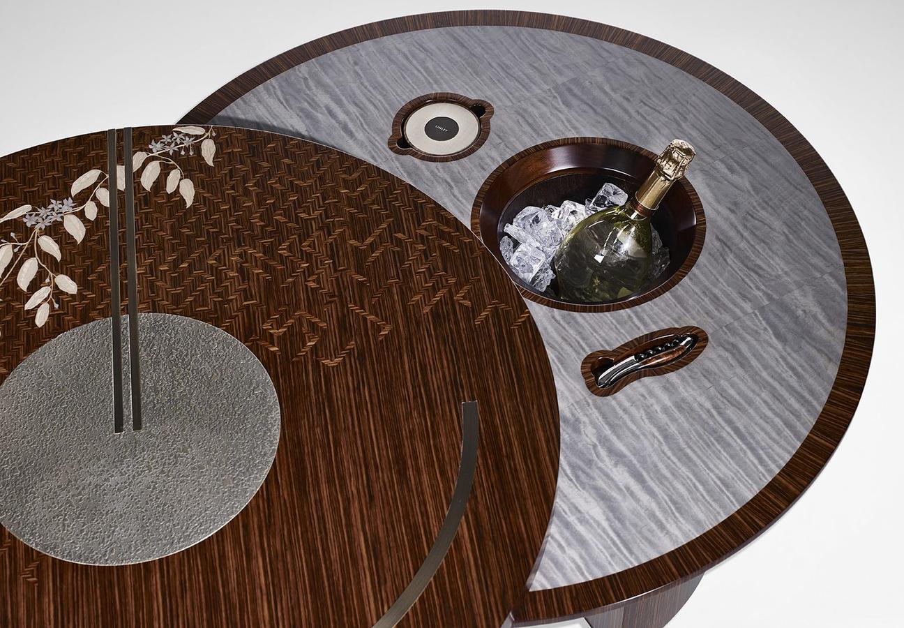 The distinguished drinks cabinet has a bookcase front which rotates inwards to reveal a luxurious bar alongside drawers for barware and accessories. The coffee table also contains a literal twist, with the top containing built-in storage for a corkscrew, bespoke stacking coasters and ice bucket. Speaking with the designers who brought the project to fruition, it is clear their hope is for a buyer to invest in the whole collection as a set.